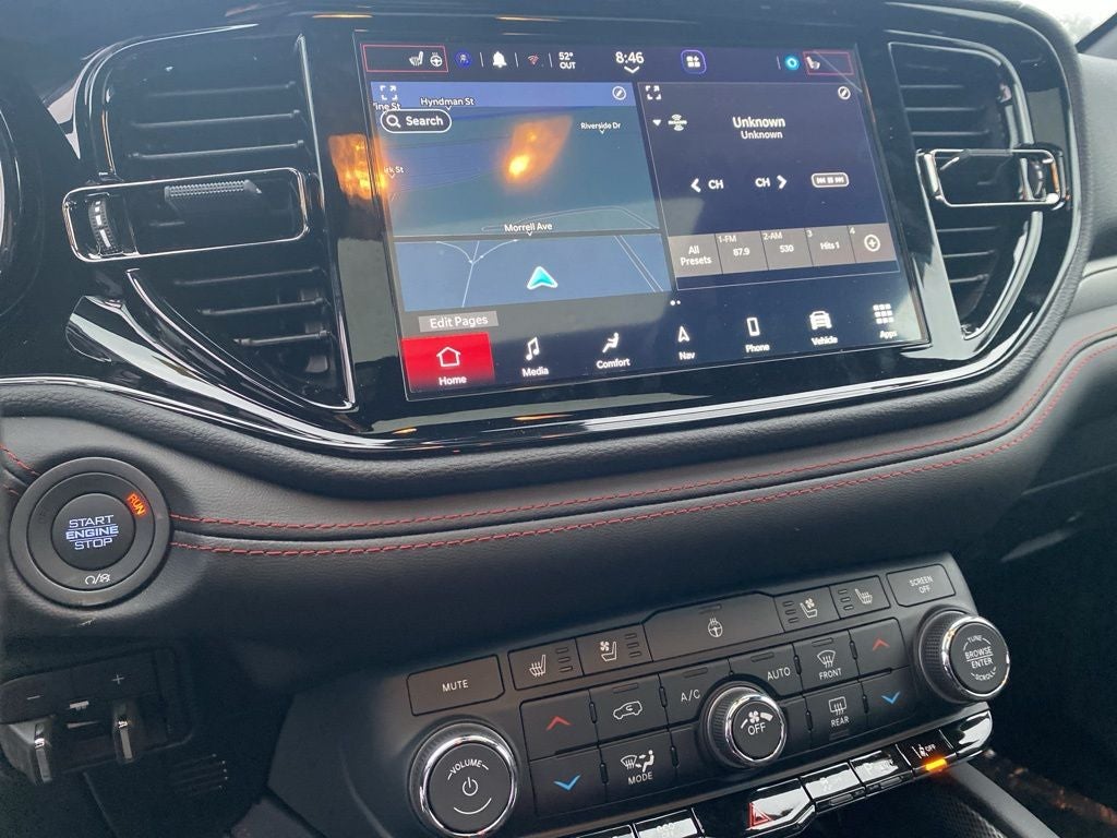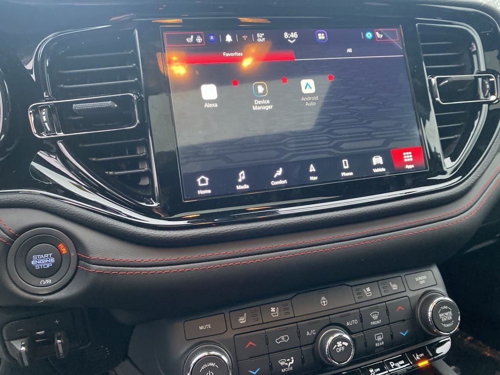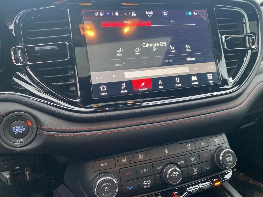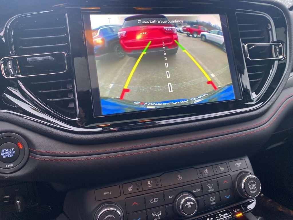 DB Black Crystal Clearcoat 2026 Dodge Durango GT HEMI V8 AWD 8-Speed Automatic HEMI 5.7L V8 Multi Displacement VVT AWD, 3.09 Rear Axle Ratio, 3rd row seats: split-bench, 4-Wheel Disc Brakes, 7 and 4 Pin Wiring Harness, 9 Speakers, ABS brakes, Air Conditioning, Alloy wheels, AM/FM radio: SiriusXM w/360L, Apple CarPlay/Android Auto, Auto-dimming Rear-View mirror, Auto-leveling suspension, Automatic temperature control, Black Roof Rails, Blacktop Package, Blind Spot with Trailer Detection, Brake assist, Bumpers: body-color, Cargo Net, Class IV Receiver Hitch, Cloth Bucket Seats with Shift Insert, Compass, Delay-off headlights, Driver door bin, Driver vanity mirror, Dual front impact airbags, Dual front side impact airbags, Electronic Stability Control, Emergency communication system: Dodge Connect, Exterior Mirrors with Heating Element, Four wheel independent suspension, Front anti-roll bar, Front Bucket Seats, Front Center Armrest w/Storage, Front dual zone A/C, Front License Plate Bracket, Front reading lights, Fully automatic headlights, Garage door transmitter, Gloss Black Badges, Gloss Black Exterior Mirrors, Heated door mirrors, Heated front seats, Heated steering wheel, Illuminated entry, Integrated Roof Rail Crossbars, Knee airbag, Leather steering wheel, Low tire pressure warning, MOPAR All Weather Package, MOPAR Front and Rear Door Entry Guards, MOPAR Slush Mats, MyFlexCare Service Plan, Navigation System, Occupant sensing airbag, Outside temperature display, Overhead airbag, Overhead console, Panic alarm, ParkView Rear Back-Up Camera, Passenger door bin, Passenger vanity mirror, Power door mirrors, Power driver seat, Power Liftgate, Power steering, Power windows, Quick Order Package 22S GT, Radio data system, Radio: Uconnect 5 Nav with 10.1 Display, Rain sensing wipers, Rear air conditioning, Rear anti-roll bar, Rear Load Leveling Suspension, Rear reading lights, Rear seat center armrest, Rear window defroster, Rear window wiper, Red Accent Stitching, Remote keyless entry, Satin Black Dodge Tail Lamp Badge, Security system, Speed control, Speed-sensing steering, Speed-Sensitive Wipers, Split folding rear seat, Spoiler, Sport steering wheel, Steering wheel mounted audio controls, Tachometer, Telescoping steering wheel, Tilt steering wheel, Traction control, Trailer Brake Control, Trailer Tow Group IV, Trip computer, Variably intermittent wipers, Voltmeter, Wheels: 20 x 8 Black Noise Split 5-Spoke, Wheels: 20 x 8 Satin Carbon Split 5-Spoke, AWD.