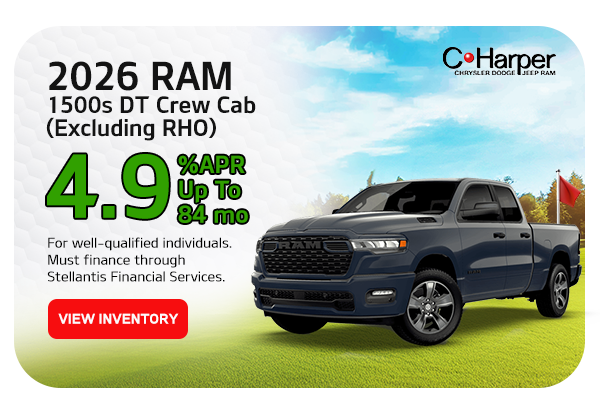 Available on all 2026 Ram 1500 DT Crew Cab (excluding RHO) 4.9% APR up to 84 months. For well qualified individuals. Must finance through Stellantis Financial Services. Not all will qualify. No downpayment required. Stackable with Bonus Cash offers. Cost per $1,000 is $14.08 for 84 months. Vehicle shown for illustrative purposes only. Multiple available. Sales ends 04/30/2026