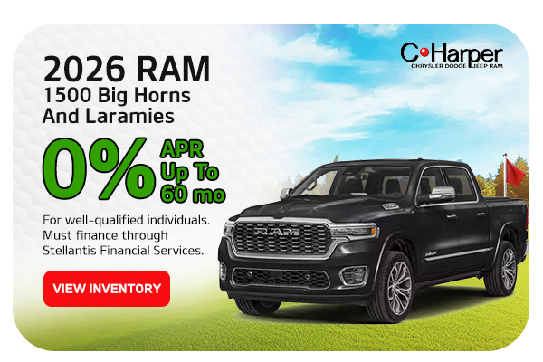 Available on all 2026 Ram 1500 Big Horns and Laramies 0% APR for 60 months. For well qualified individuals. Must finance through Stellantis Financial Services. Not all will qualify. No downpayment required. Not combinable with other offers. Cost per $1,000 is $16.67 for 60 months. Vehicle shown for illustrative purposes only. Multiple available. Sales ends 04/30/2026