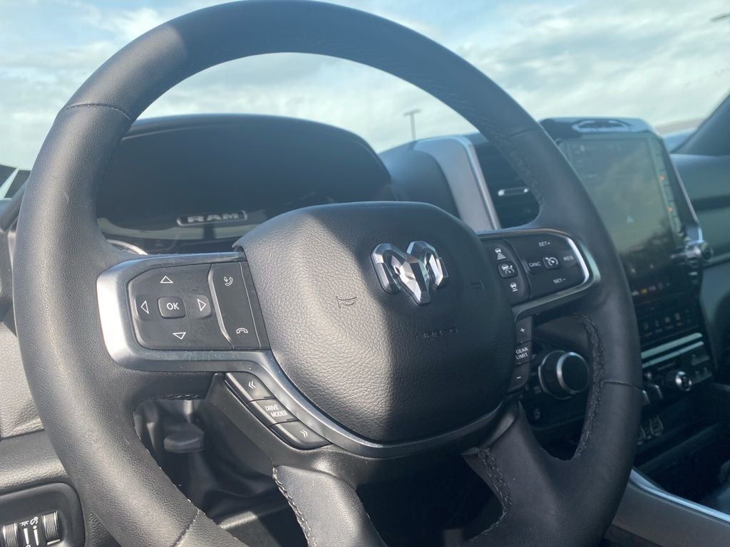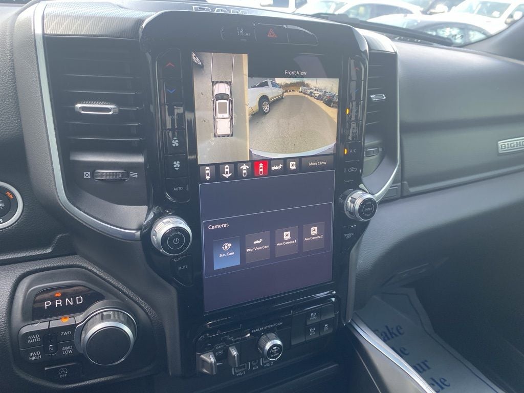 115V Auxiliary Power Outlet, 115V Auxiliary Rear Power Outlet, 12-Way/1-Way Trailer Connector, 12 Touchscreen Display, 2nd Row In Floor Storage Bins, 3 Rear Seat Head Restraints, 3.21 Rear Axle Ratio, 33 Gallon Fuel Tank, 4 Way Front Headrests, 4-Wheel Disc Brakes, 400W Inverter, 4G LTE Wi-Fi Hot Spot, 6 Speakers, 9 Amplified Speakers w/Subwoofer, ABS brakes, Accent Color Door Handles, Accent Color Premium Power Mirrors, Accent Color Tailgate Handle, Air Conditioning, Air Conditioning ATC w/Dual Zone Control, Alloy wheels, AM/FM radio, Anti-Spin Differential Rear Axle, Apple CarPlay, Apple CarPlay/Android Auto, Auto High-beam Headlights, Auto Power-Folding Mirrors, Auto-Dimming Exterior Driver Mirror, Auto-Dimming Rear-View Mirror, Bed Utility Group, Big Horn Badge, Big Horn Level 2 Equipment Group, Black Exterior Mirrors, Black Exterior Truck Badging, Black Headlamp Bezels, Black Interior Accents, Black Painted Exterior Mirrors Caps, Black Premium Power Mirrors, Black Tail Lamp Bezels, Black Trailer Tow Power Mirrors, Body Color Front Bumper, Body Color Rear Bumper w/Step Pads, Brake assist, Bucket Seats, Bumpers: chrome, Cloth Bench Seat, Cluster 7.0 TFT Color Display, Compass, Configurable Drive Mode, Connected Travel & Traffic Services, Connectivity - US/Canada, Convex Wide-Angle Exterior Mirror Insert, Delay-off headlights, Deluxe Cloth Bucket Seats, Driver door bin, Dual front impact airbags, Dual front side impact airbags, Electronic Stability Control, Exterior 115V AC Outlet, Exterior Mirrors Courtesy Lamps, Exterior Mirrors w/Heating Element, Exterior Mirrors w/Supplemental Signals, Front anti-roll bar, Front Center Armrest w/Storage, Front fog lights, Front reading lights, Front Seat Back Map Pockets, Front wheel independent suspension, Full Length Floor Console, Fully automatic headlights, Glove Box Lamp, Google Android Auto, GPS Antenna Input, GPS Navigation, Grille Black Surround Black Mesh, HD Radio, Heated door mirrors, Heated Front Seats, Heated Steering Wheel, Illuminated entry, Integrated Voice Command w/Bluetooth®, Leather Wrapped Steering Wheel, LED Dome Lamp w/On/Off Switch, LED Footwell Lighting, Low tire pressure warning, Manual Adjust 4-Way Front Passenger Seat, Manual Folding Exterior Mirrors, Manual Telescoping Mirrors, Media Hub w/2 Charge Only USBs, Mirror Clearance/Running Lights, MOPAR 4 Adjustable Cargo Tie-Down Hooks, Mopar Black Tubular Side Steps, MOPAR Front & Rear Rubber Floor Mats, MOPAR Spray In Bedliner, Night Edition, Occupant sensing airbag, Outside temperature display, Overhead airbag, Overhead console, Overhead LED Lamps, Panic alarm, ParkView Rear Back-Up Camera, Passenger door bin, Passenger vanity mirror, Pick-Up Box Lighting, Power 2-Way Driver Lumbar Adjust, Power Adjust 8-Way Driver Seat, Power Adjustable Pedals, Power door mirrors, Power steering, Power windows, Power-Adjustable Convex Aux Mirrors, Premium Overhead Console, Quick Order Package 23Z Big Horn, Radio data system, Radio: Uconnect 5 Nav w/12.0 Display, Radio: Uconnect 5 W w/8.4 Display, RAM Grille Badge - Black, RAM Grille Badge - Chrome, Rear 60/40 Folding Seat, Rear anti-roll bar, Rear Center Armrest, Rear Power Sliding Window, Rear seat center armrest, Rear step bumper, Rear Window Defroster, Remote keyless entry, Remote Tailgate Release, Security Alarm, SiriusXM w/360L, Speed control, Split folding rear seat, Steering Wheel Mounted Audio Controls, Sun Visors w/Illuminated Vanity Mirrors, Supplier Part Tracking (J-1), Surround View Camera System, Tachometer, Telescoping steering wheel, Tilt steering wheel, Towing Technology Group, Traction control, Trailer Brake Control, Trailer Hitch Line-Up Assist, Trailer Reverse Steering Control, Trailer Tire Pressure Monitoring System, Trailer Tow Group, Trailer Tow Mirrors, Trip computer, Universal Garage Door Opener,